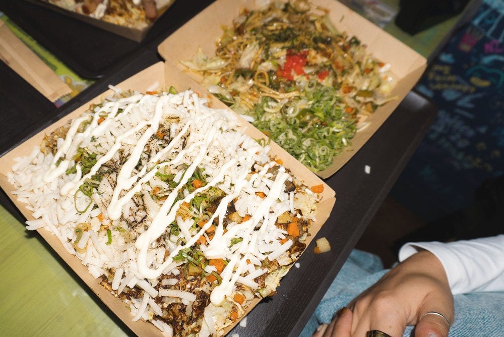 Oko Okonomiyaki Bar - a one woman show! Shiho runs this establishment by herself (she does it ALL — takes orders, makes the food, etc.) And here you can find both vegan and non vegan options for the famous okonomiyaki.